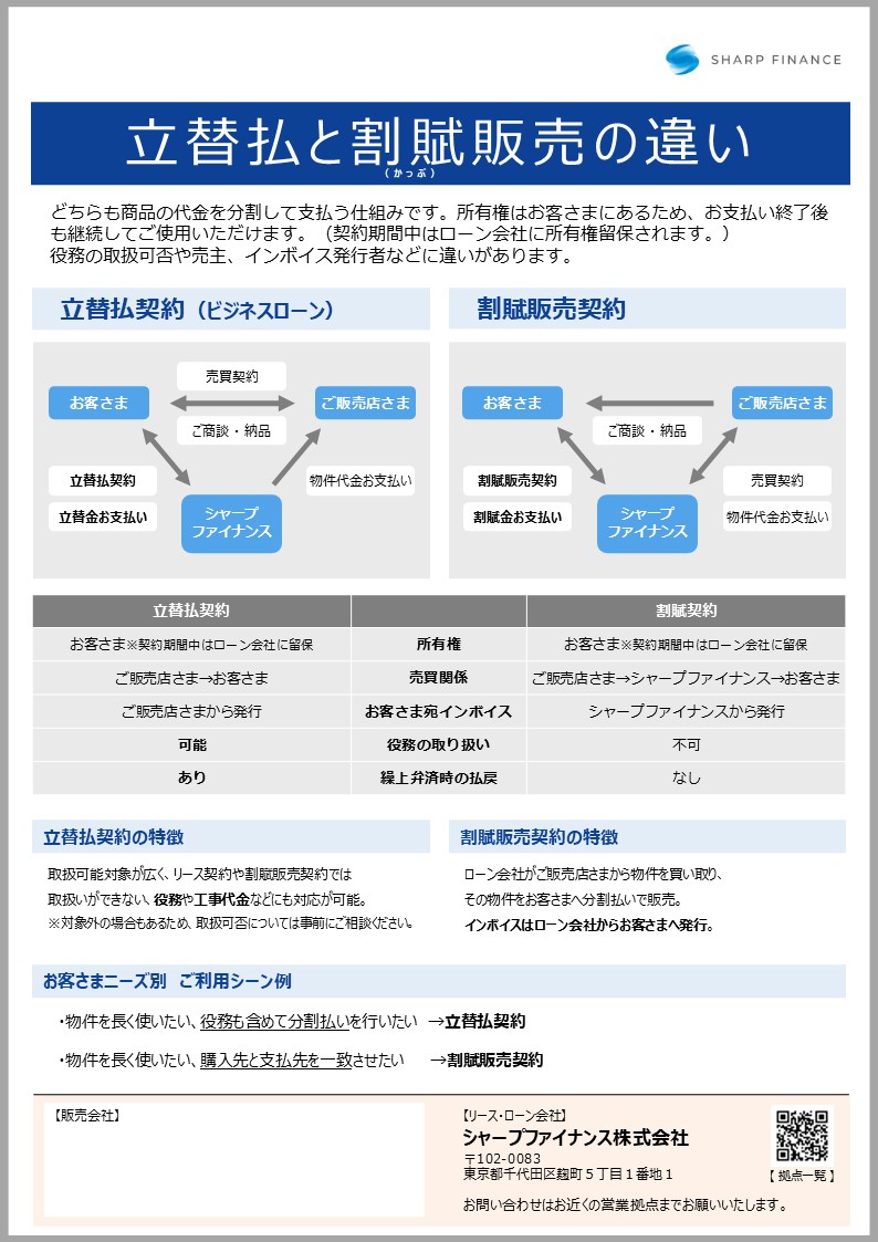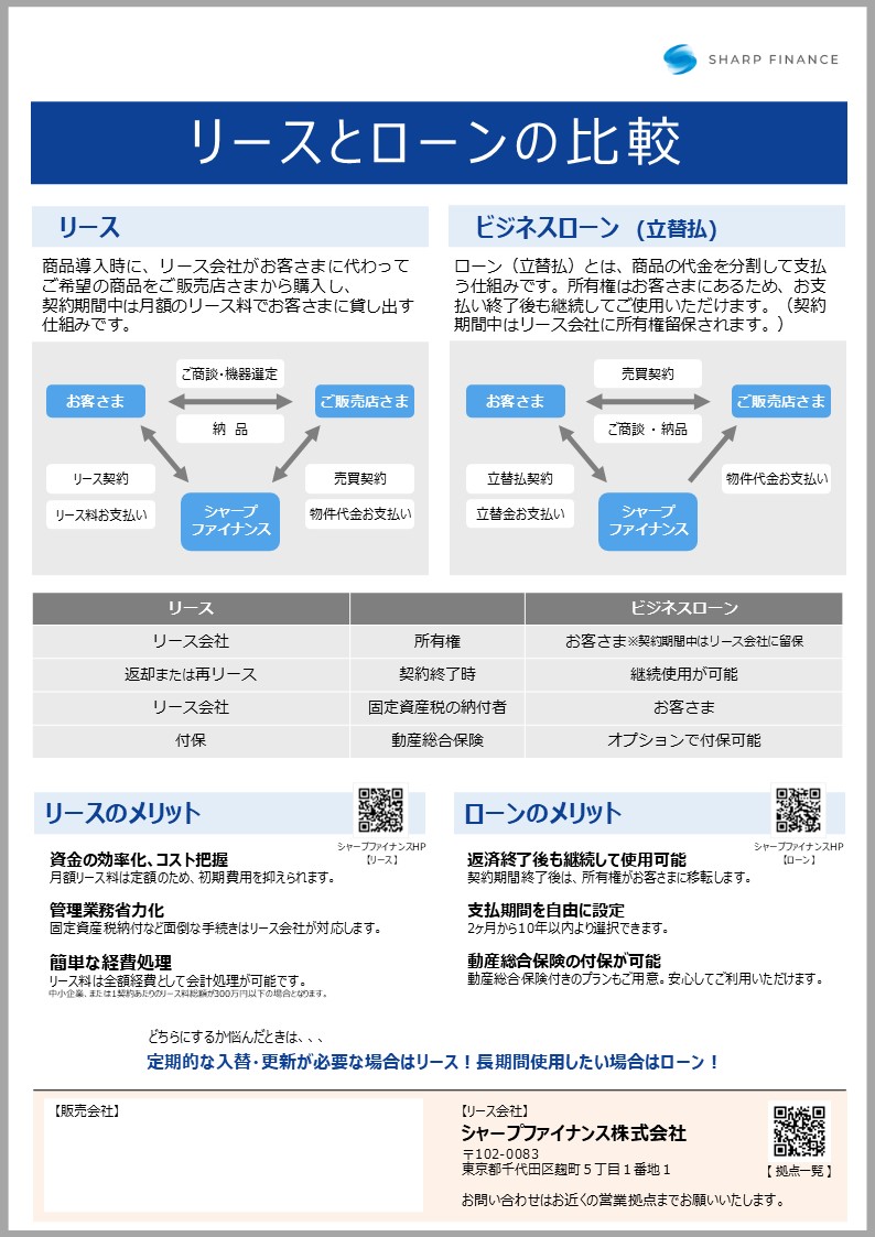 (記入例も含まれます)リース契約のご案内 リース契約締結時にお客さまにお渡しください リース契約のご案内 シャープビジネスローン契約について ローン契約締結時にお客さまにお渡しください ローン契約のご案内 リース取引のインボイス リース契約締結前のお客さま向け資料です リース取引のインボイス レベルアップ契約のインボイス リース物件を入れ替える際のお客さま向け資料です レベルアップ契約のインボイス -